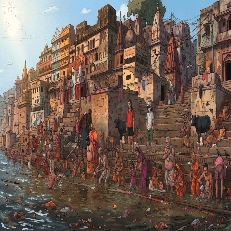 ヒンドゥー教徒にとって、川沿いの階段での沐浴は体を洗う風呂ではなく、罪を洗い流す儀式である。だが、現実の川面は、そんな精神性を嘲笑うかのように濁り、淀んでいる。