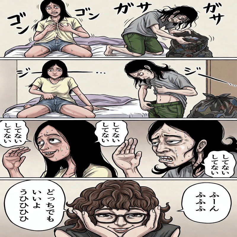 「シンくんもまんざらでもないんでしょ。だって、二人のおっぱい、見てるもん。チラチラ見てる。ひひひ」