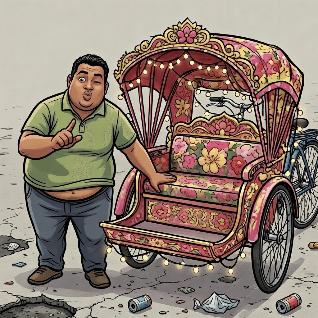 マラッカの街角には、トライショーと呼ばれる人力車が跋扈している。赤、ピンク、黄色。およそ正気とは思えない彩度のファンシーカラーでデコレーションされたそれらは、さながら移動式の電飾仏壇である。