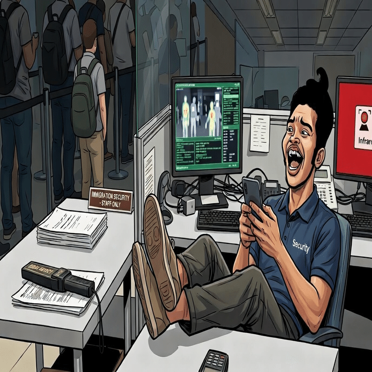 世の中には「絶対に笑ってはいけない場所」があるが、ここはまさにそれだ。国家の威信が交差するイミグレーションの最前線で、僕は不謹慎という名の着火剤に火をつけてしまったのだ。