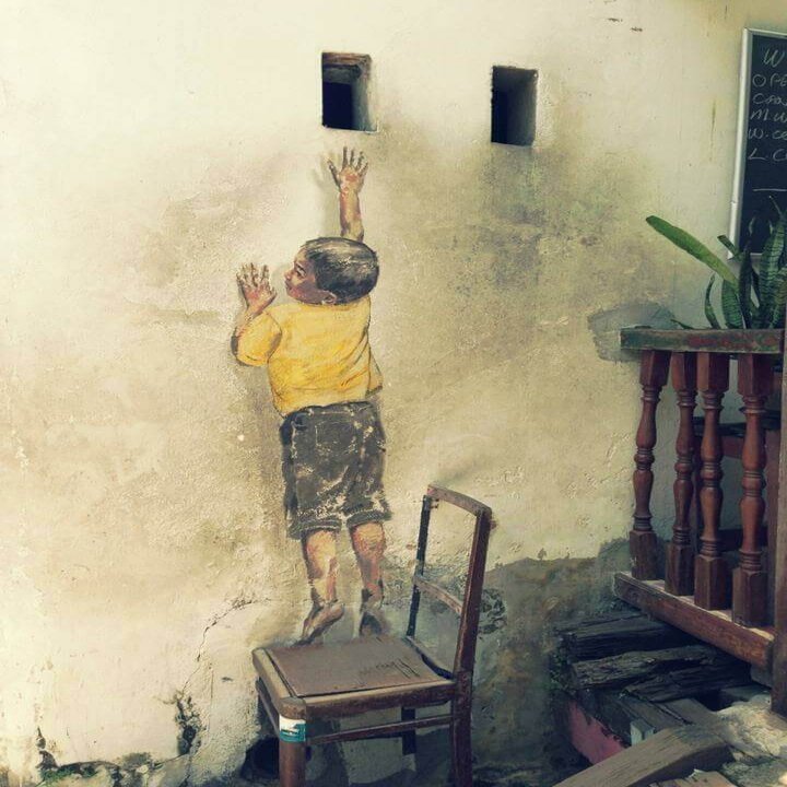 ジョージタウンの壁面には、無数の物語が張り付いている。窓や自転車などの実物のまわりに絵が描かれている。